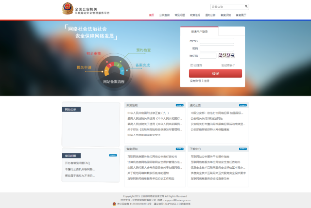 三、提交备案以后等待公安分局网安大队进行审核,对于非交互式网站,分局网安大队审核后可直接发放备案编号;对于交互式网站,分局网安大队进行网上核验后将通过电话或短信通知网站主预约时间进行当面核验和实地检查,完成备案手续。网站备案审核通过以后,网站主登录全国公安机关互联网站安全服务管理平台取得公安机关备案编号,并将备案编号放置于网站首页最下方,此时方视为履行完整个备案手续。如下图