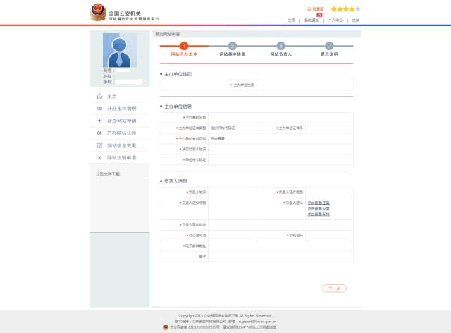 二、登录系统以后,按步骤填写网站主办单位信息、负责人信息及网站信息,进行提交
